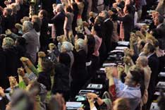 Some delegates stand to protest the church's position on homosexuality. A UMNS photo by Paul Jeffrey.