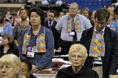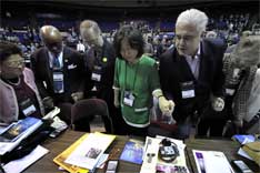 Delegates from the New York Annual (regional) Conference pray together. A UMNS photo by Paul Jeffrey.