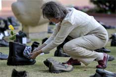 Laurie Hays Coffman examines boots and shoes that symbolize people killed in the U.S. invasion and occupation of Iraq. A UMNS photo by Paul Jeffrey.
