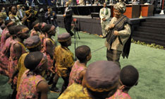 Sirleaf dances with the Hope for Africa Children's Choir after addressing the assembly. A UMNS photo by Paul Jeffrey.
