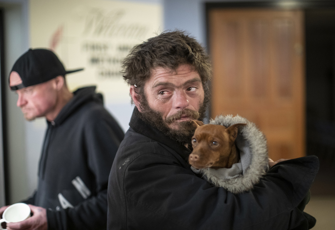 Chester Ruff attends Sunday breakfast for the homeless at First United Methodist Church in Salt Lake City. He holds a miniature pincher named Eleanor.