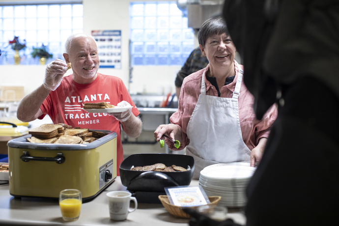 Church volunteers, Jim Ecker and Ginny Hjalmarson prepare and serve French toast during the Sunday Fellowship Breakfast at First United Methodist Church in Salt Lake City.