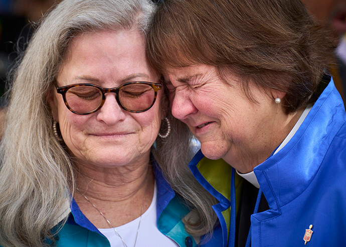 La Obispa Karen Oliveto a la derecha y su esposa, Robin Ridenour, reaccionan el 1 de mayo después de que la Conferencia General Metodista Unida reunida en Charlotte, Carolina del Norte, votara a favor de eliminar la prohibición de la denominación sobre la ordenación de clérigos/as que son “homosexuales practicantes declarados/as”. " Foto de Paul Jeffrey, Noticias MU.