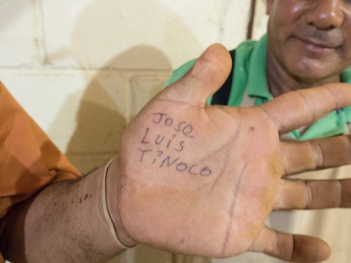 Es muy ruidoso dentro de la fábrica de cigarros, así que José Luis Tinoco encontró más fácil escribir su nombre en la mano para identificarse con la reportera visitante. Tinoco y Santos Martínez trabajan en el proceso de fermentación y rehidratan cada hoja con una manguera de goma en una pequeña habitación húmeda. Foto de Kathy L. Gilbert, UMNS.
