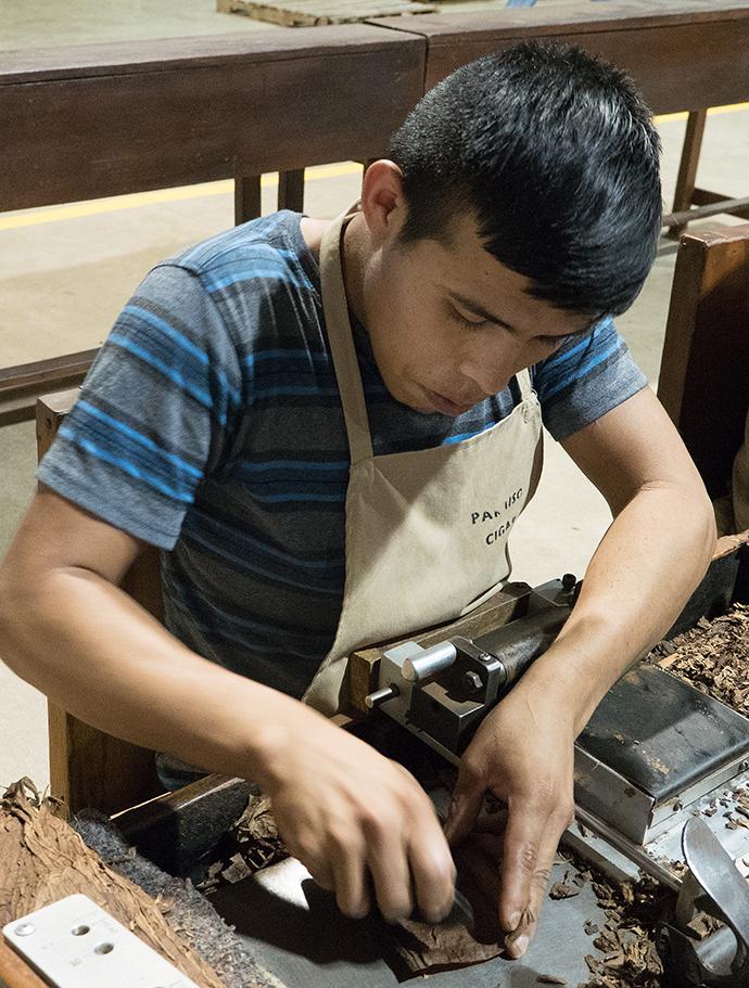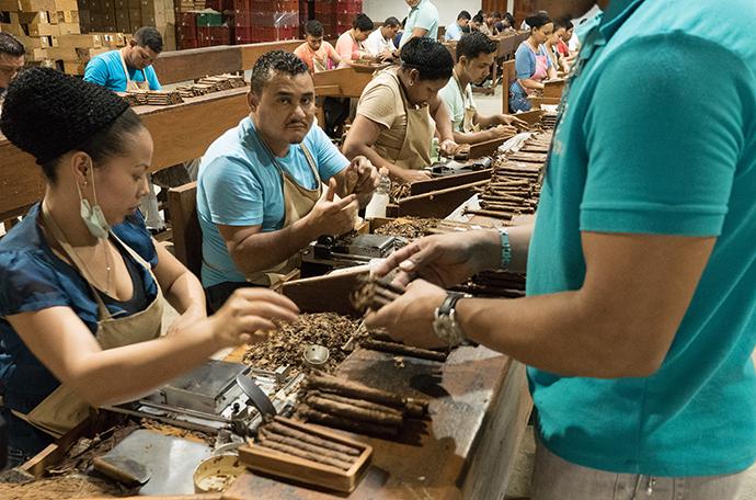 Un trabajador se detiene en cada estación para recoger los cigarros enrollados a mano y llevarlos a la siguiente área para ser envueltos en celofán, etiquetados y puestos en cajas.