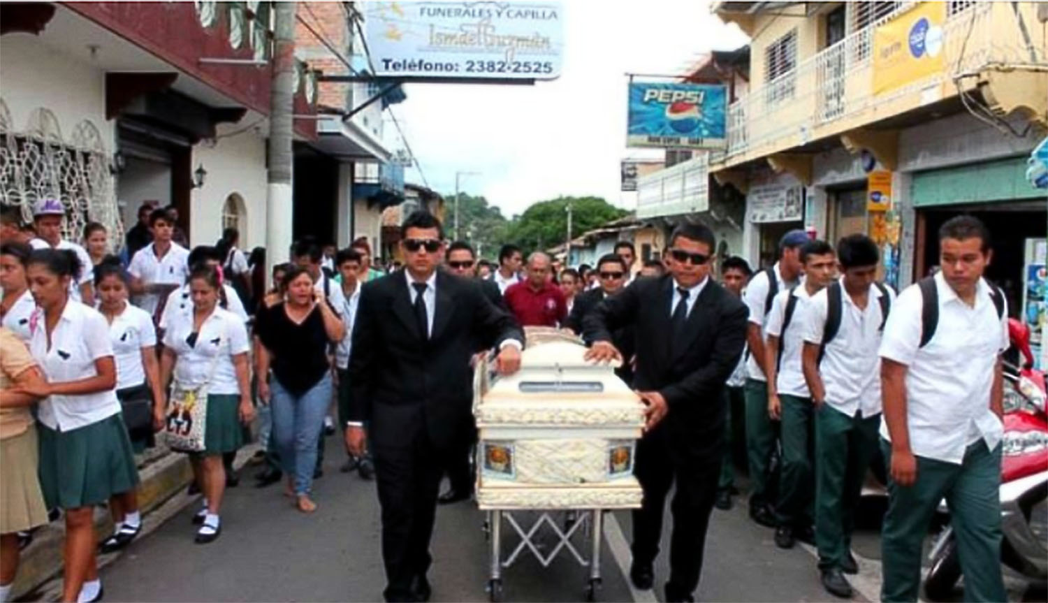 Cortejo fúnebre para un estudiante asesinado como parte de un rito de iniciación, de pandillas en la ciudad natal de Consuelo en El Salvador. Foto Angel E. cortesía de JFON.