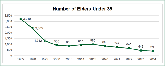 Ce que le centre peut mesurer, c'est qu'après des années de gains modestes depuis un point bas en 2005, le nombre d'anciens âgés de moins de 35 ans a commencé à diminuer en 2017, dans un contexte de discussions croissantes sur une éventuelle séparation confessionnelle. Trois ans plus tard, les rangs des jeunes anciens ont entamé un déclin majeur. Depuis 2019, lorsque les divisions confessionnelles se sont encore aggravées et que les désaffiliations ont commencé, le nombre d'anciens de moins de 35 ans a chuté de 63 %.