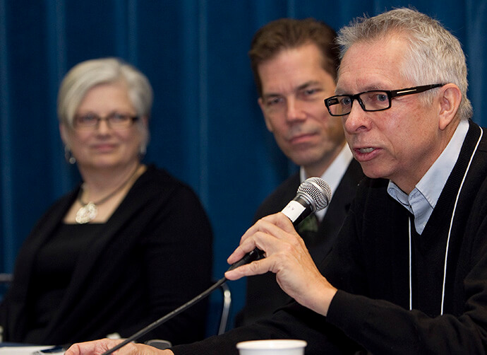 Le révérend Bruce W. Robbins (à droite) participe à l'animation d'une discussion sur les "questions difficiles" auxquelles est confrontée l'Église Méthodiste Unie lors de la réunion d'information précédant la Conférence Générale au Tampa Convention Center, en Floride, en 2012. Robbins était alors pasteur de l'Église Méthodiste Unie de Hennepin Avenue à Minneapolis. À gauche, les Révs. Stephanie Hixon et Thomas Lambrecht. Photo de Mike DuBose, UM News.