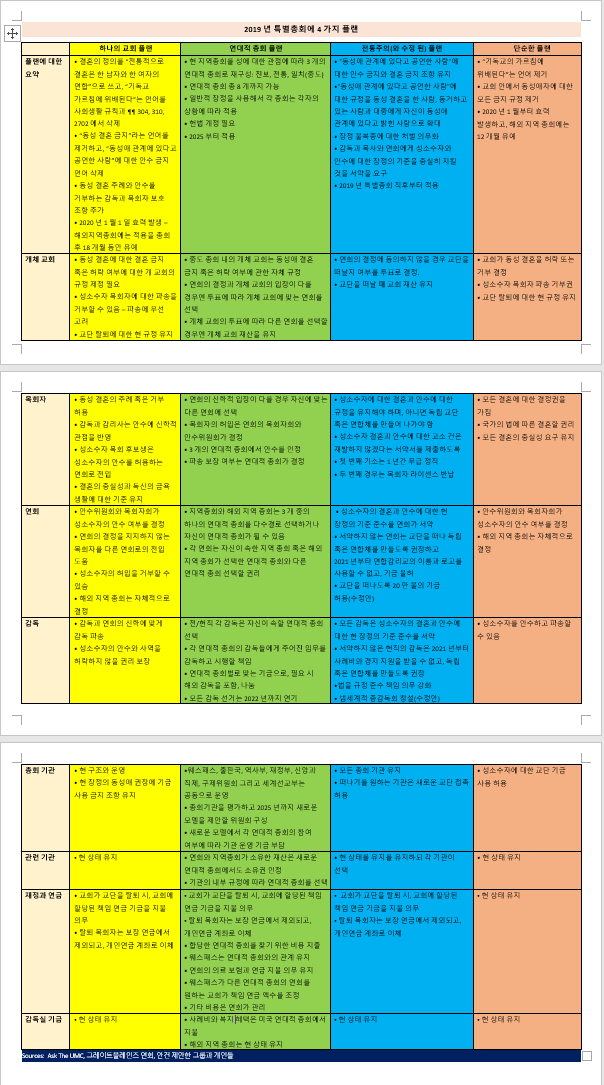 • 현 지역총회를 성에 대한 관점에 따라 3개의 연대적 총회로 재구성: 진보, 전통, 일치(중도) • 연대적 총회 총 8개까지 가능 • 일반적 장정을 사용해서 각 총회는 각자의 상황에 따라 적용 • 헌법 개정 필요 • 2025부터 적용 |