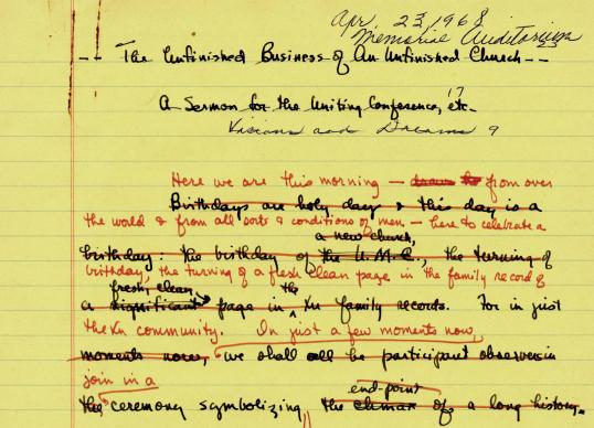 Entre os documentos do Rev. Albert C. Outler, localizado na Biblioteca Bridwell, está um rascunho do sermão pregado em 23 de abril de 1968, durante o culto realizado na Conferência de Unificação onde a Igreja Metodista Unida foi oficialmente formada. Foto cedida pela Coleção Especial da Biblioteca Bridwell da Escola de Teologia de Perkins da Universidade Metodista Do Soul.