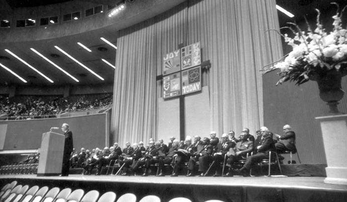 Rev. Albert C. Outler pregando em 23 de abril de 1968, como parte do culto de adoração da Conferência de Unificação realizada na cidade de Dallas, Texas. Foto cedida pela Comissão Metodista Unida de História e História.