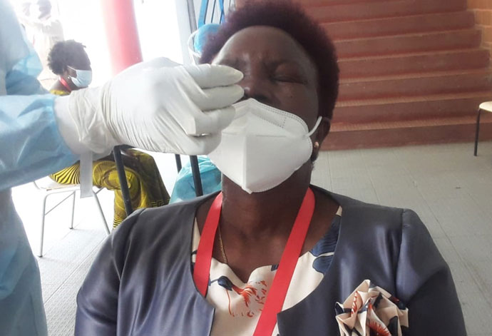 Senhora Laurinda Neto, guia leigo conferencial de Angola Oeste, no momento da testagem, na Universidade Metodista de Angola, antes da toma da vacina em Luanda. Foto de Augusto Bento.